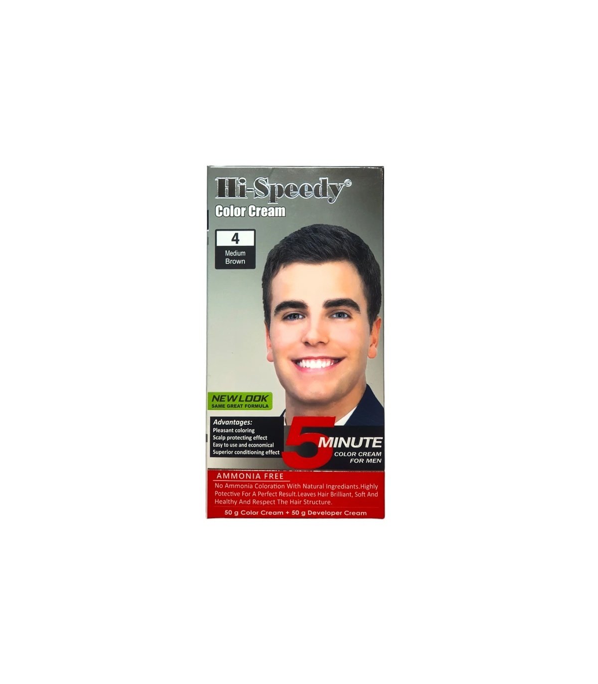 رنگ موی مردانه های اسپیدی شماره ۴ محصول برند Hi-Speedy است که با فرمولاسیون سریع و ساده، پوشش کامل موهای سفید را فراهم میکند. این رنگ با طیف قهوهای متوسط طبیعی، ظاهری جذاب و جوانتر ایجاد کرده و استفاده آسان آن باعث محبوبیت در میان آقایان شده است.